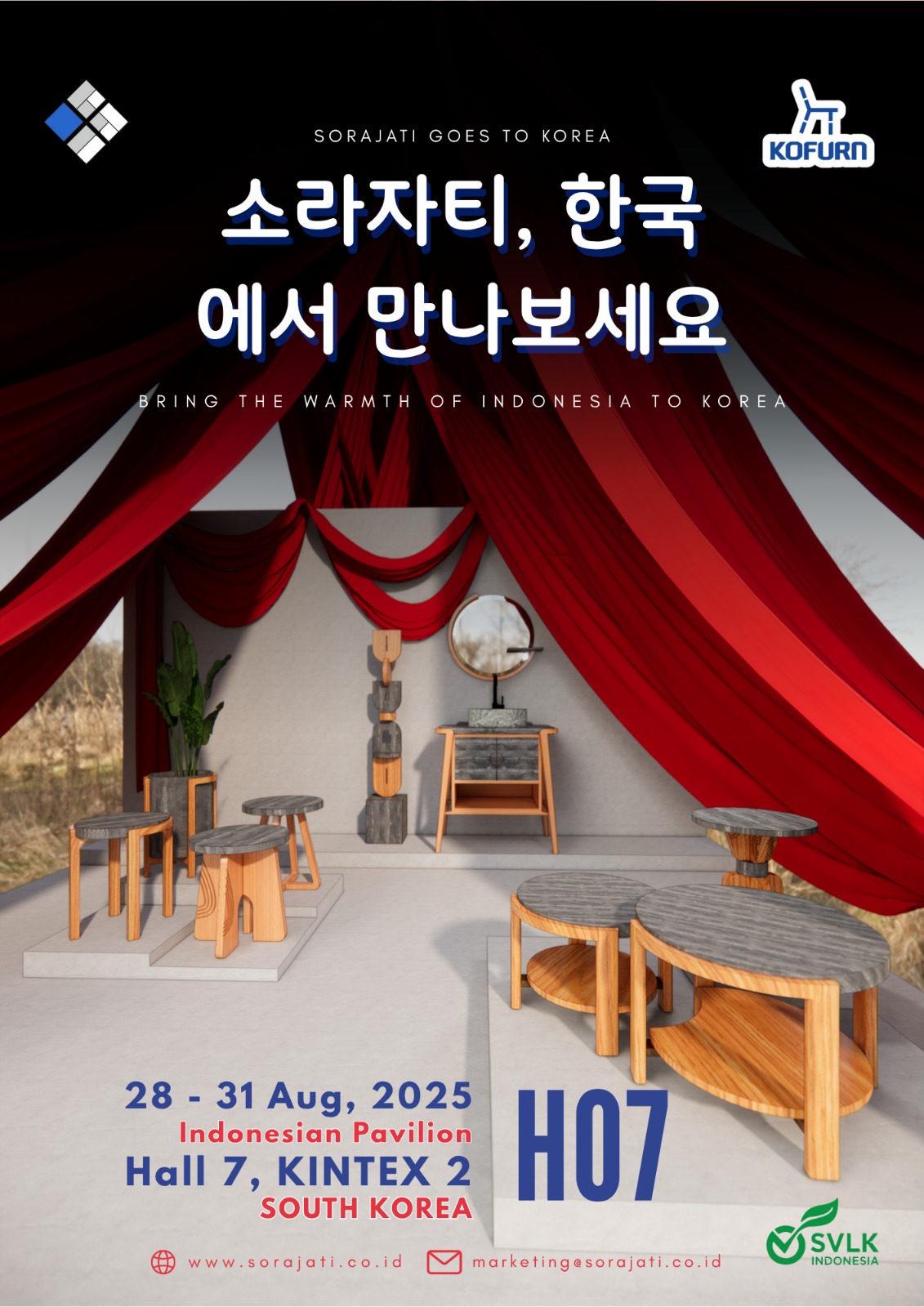 Sorajati has been selected as one of the companies representing Indonesia at KOFURN 2025, held at KINTEX, South Korea, from 28 – 31 August 2025. At this prestigious international exhibition, we will showcase a curated collection of Indonesian-inspired furniture, bringing the warmth, craftsmanship, and cultural elegance of Indonesia to the South Korean market.It would be our pleasure to welcome you to our booth and personally share our latest creations with you.